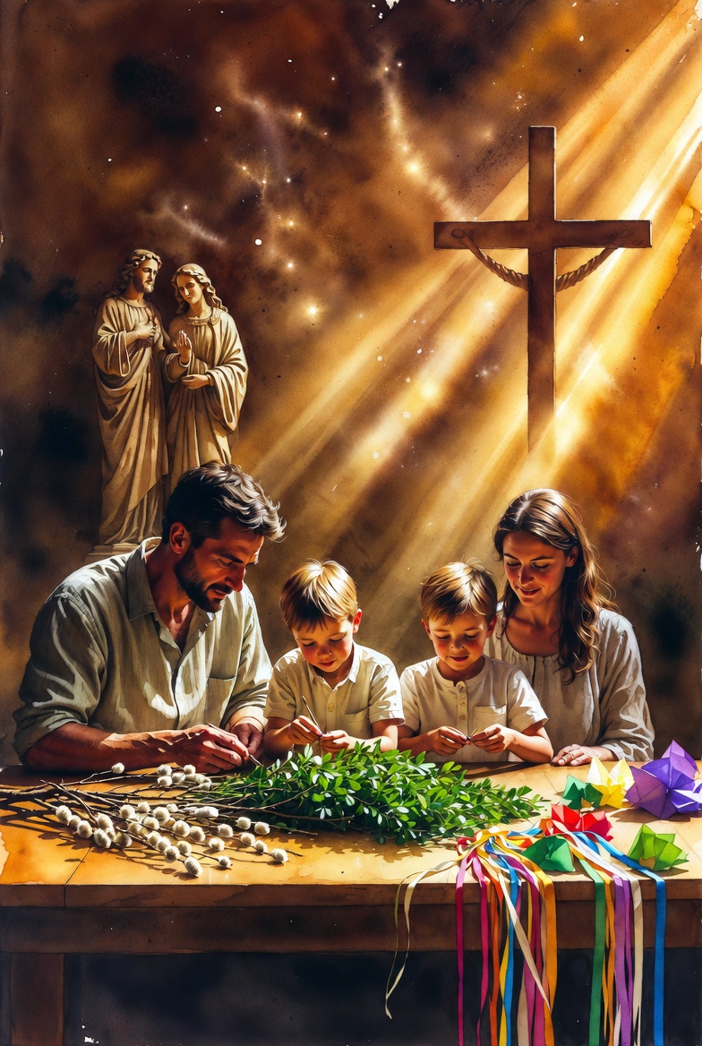 Dieses gemeinsame Basteln ist weit mehr als eine handwerkliche Tätigkeit. Es ist ein lebendiger Akt des sozialen Zusammenhalts und der Wertevermittlung. Vater und Mutter sitzen mit den Kindern am Tisch, erzählen von der Bedeutung des Palmsonntags, singen leise ein Kirchenlied oder beten gemeinsam. Die kleinen Hände lernen Geduld, Sorgfalt und Kreativität. Die Eltern üben sich in liebevoller Führung – als väterliche und mütterliche Begleiter, die den Glauben nicht nur mit Worten, sondern mit dem Herzen weitergeben.